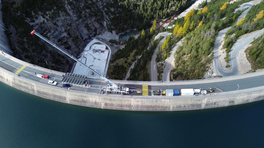 Der Kran und Teile der Baustelleninstallation befinden sich auf der Staumauerkrone. Der Verkehr Richtung Livigno, welcher über die Mauer verläuft, wird während der Arbeiten einspurig mit Lichtsignalanlage geregelt.